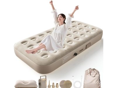 電動エアポンプ内蔵エアーベッド。厚みが25cmもあるので、普段のベッドや来客用としても使えます! 枕、Type-C充電ケーブル、収納バッグなどもセットイン