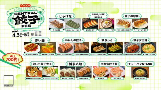 併せて、全国各地から個性あふれる人気餃子が集結する「CENTRAL 餃子フェス」の開催も決定。東の聖地・宇都宮のシンプル王道餃子、地元・横浜の人気町中華のエスニック餃子、大阪の人気ラーメン店のシビ辛餃子、西の聖地・博多の名物ひと口餃子など、栃木県から福岡県まで全国各地から、見た目も楽しい様々にアレンジされた20種類の餃子が味わえる。