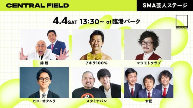 さらに4月4日には、CENTRAL FIELD(臨港パーク)の特設ステージにて「SMA 芸人ステージ」を開催。錦鯉、アキラ100%、マツモトクラブをはじめ、実力派から個性派まで多彩なSMA芸人6組の出演が決定した。