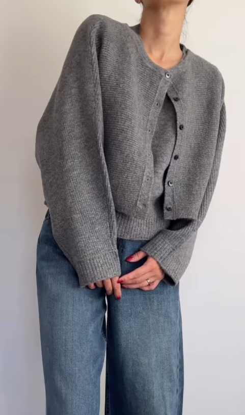 季節の変わり目に重宝するグレーのニット。mhi_7746さんが選んだのは、着るだけで奥行きが生まれるGUの「パフニット2ピースカーディガン」値下げで1,990円(166cmでXLサイズ着用)です。カーディガンとタンクトップがセットになったこの一着は、程よい肉厚感で肌触りがよく、インナーに悩まず着こなせるのが魅力。クロップド丈のコンパクトなシルエットが腰位置を高く見せ、ワイドデニムとの組み合わせも野暮ったくなりません。