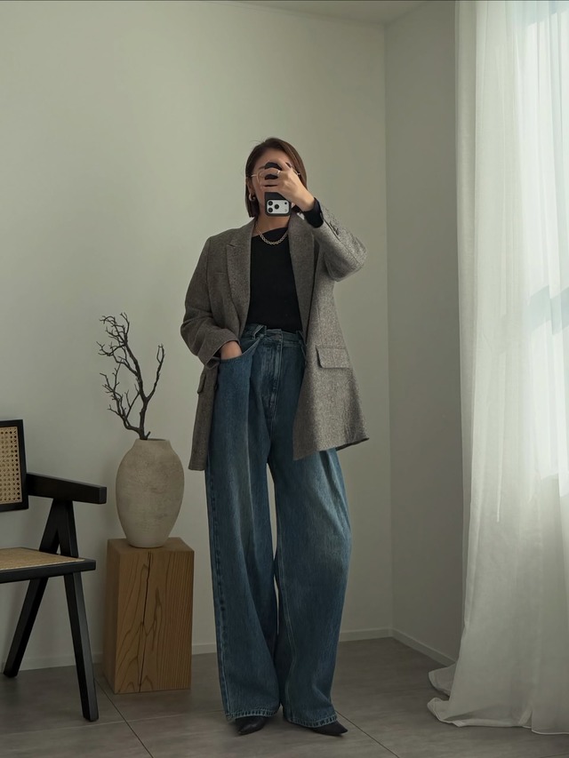 グレーのチェック柄ジャケットにワイドデニムを合わせた、reeechan419さんのトラッドな装い。インナーに選んだのは、アシンメトリーなネックラインが目を引くリブニット。ジャケットのVゾーンからさりげなくのぞく変形デザインが、顔まわりにモダンなアクセントを加えています。