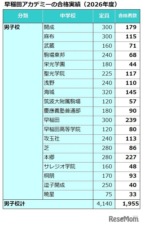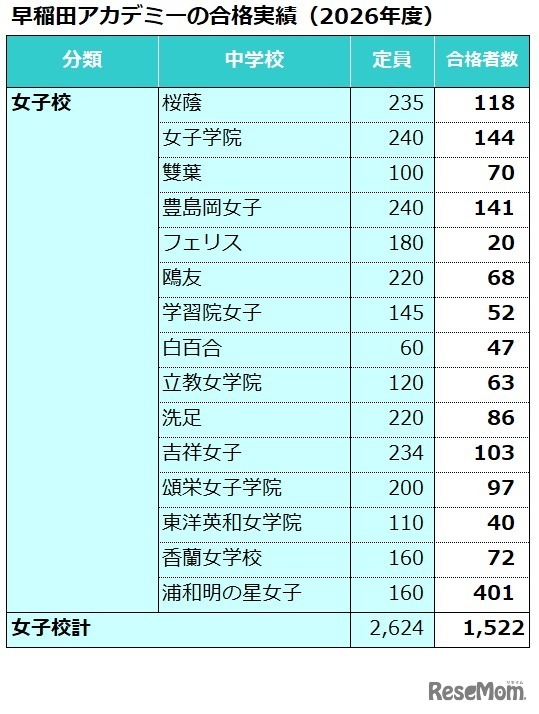 本稿での合格実績は、東京・神奈川・千葉・埼玉の1都3県から独自にピックアップした難関中学校52校(男子校19校・女子校15校・共学校12校・公立中高一貫校6校)を対象にしている。早稲田アカデミーの合格者数データは3月13日時点での回答数値であり、集計残や繰り上げ合格などにより、数値が微増する可能性もある。