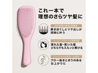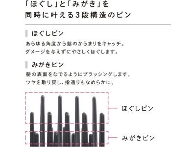 細くて繊細な髪や、ダメージヘアに。長短2段構造ブラシが、髪への負担を最小限に抑え、サラサラのつややかな髪へ。濡れ髪の状態でも使えます
