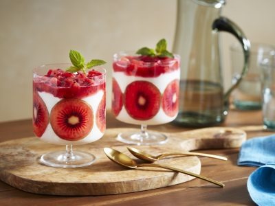 「ルビーレッドキウイの赤い果肉の美しさやベリーのような味わいを活かしたレシピは、おもてなしやご褒美スイーツに最適です。贅沢な甘さが特徴で、砂糖を控えめにしても満足感のある味わいに仕上がります。赤い断面を活かした“見せる”断面スイーツにぴったりです。皮をむいてそのまま使える手軽さも魅力で、季節感と希少感を演出できる主役級フルーツです。加熱しないことで豊富なビタミンCを効率よく摂れるメニューに仕上げています」(藤井恵先生)