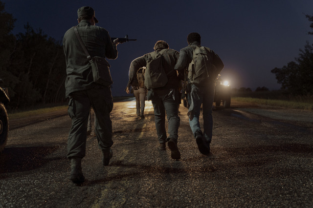 疲弊しきった相手の腕を取り、必死に支えながら夜道を進む後ろ姿や、取り乱して後ろへ戻ろうとする少年を懸命に制止する一幕、そして銃口を向けられ絶体絶命の瞬間に至るカットまで、逃げ場のない地獄の光景が続く。