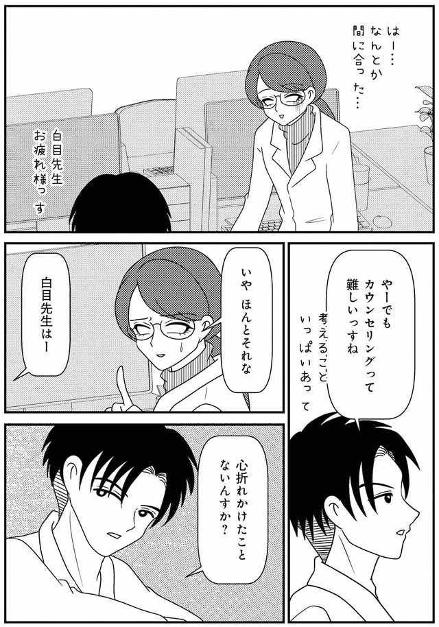 担当心理士の白目みさえは、患者様とのカウンセリングは先行きが見えず思い悩んでいた。