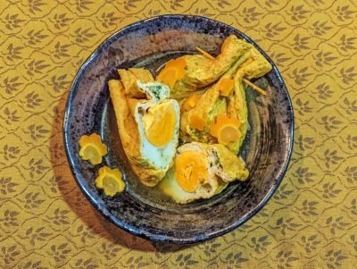 作り方は、油揚げ(すし揚げ:2枚)を熱湯で30分ほどぐつぐつと色が変わるまで茹でて油抜きをした後、半分に切ります。たまご(4個)は卵黄と卵白に分け、みじん切りにした春菊(4本)・らっきょう(5個)を卵白と合せて混ぜます。にんじん(1本)は3 mm厚の輪切りにしてから抜き型で花型にします。