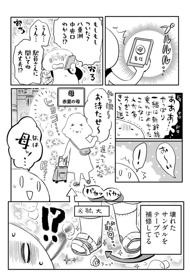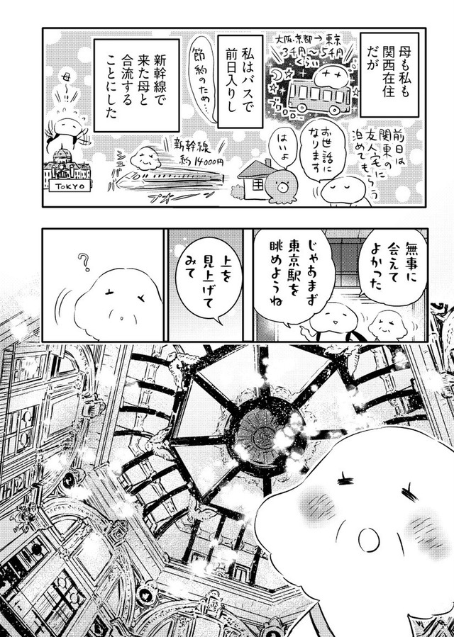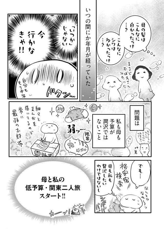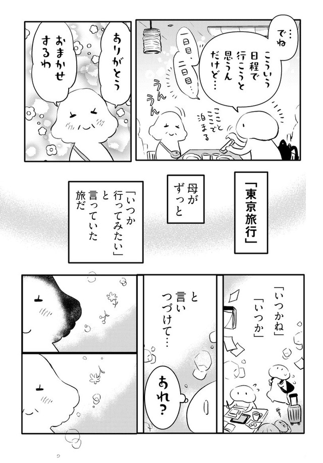 年間に何度も旅する漫画家の“私”が、旅慣れない母を連れて向かったのは関東への二人旅。壊れたサンダルで現れる母に始まり、行く先々でハプニング続出。