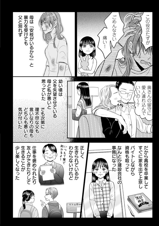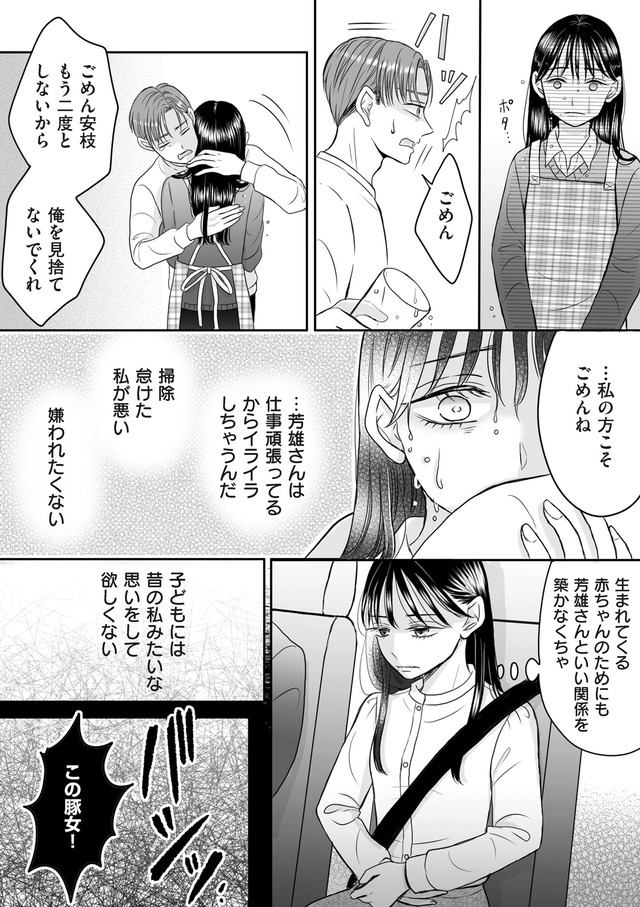 社内でも評判のエリート芳雄と結婚した安枝だが、夫からDVを受けたストレスで流産してしまう。