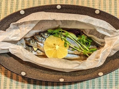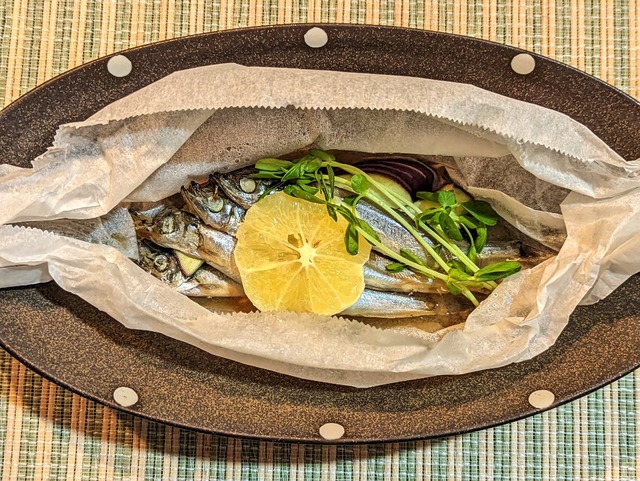 なす・ししゃも・オレンジを乗せたクッキングシートの両端をキャンディ包みのようにねじり、蒸し器で10分蒸します。器に移して、豆苗(10本)を上から添えたら出来上がりです。