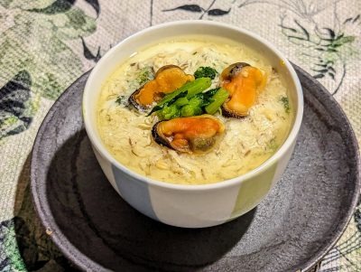 案外簡単に作れるごちそう「ムール貝・しいたけ・春菊の白みそ豆乳蒸し」