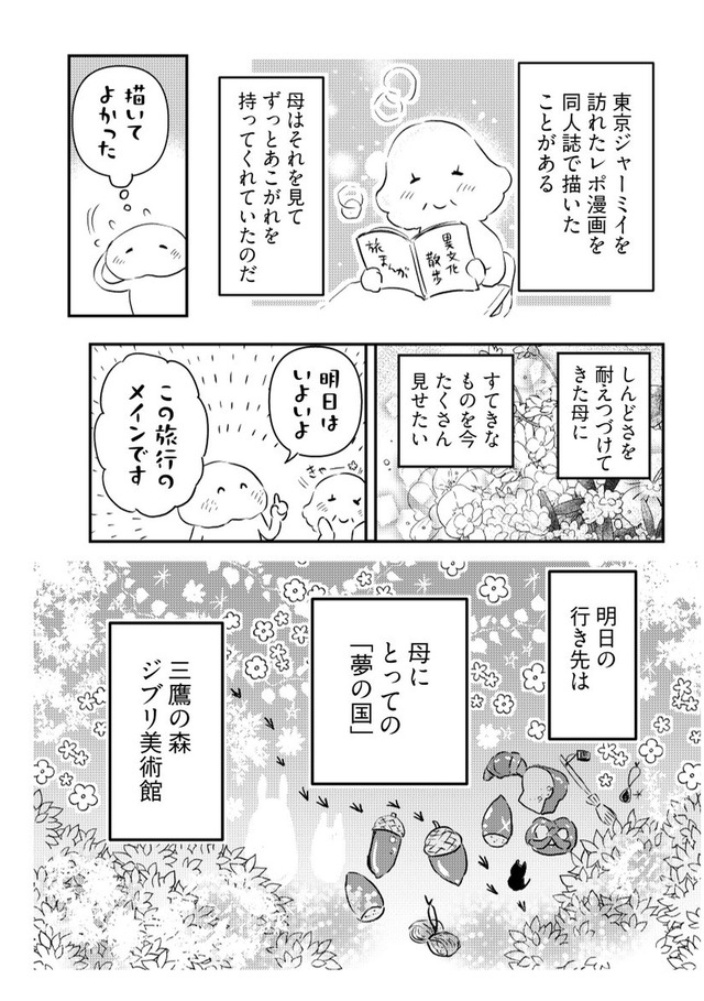 年間に何度も旅する漫画家の“私”が、旅慣れない母を連れて向かったのは関東への二人旅。壊れたサンダルで現れる母に始まり、行く先々でハプニング続出。