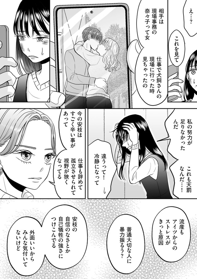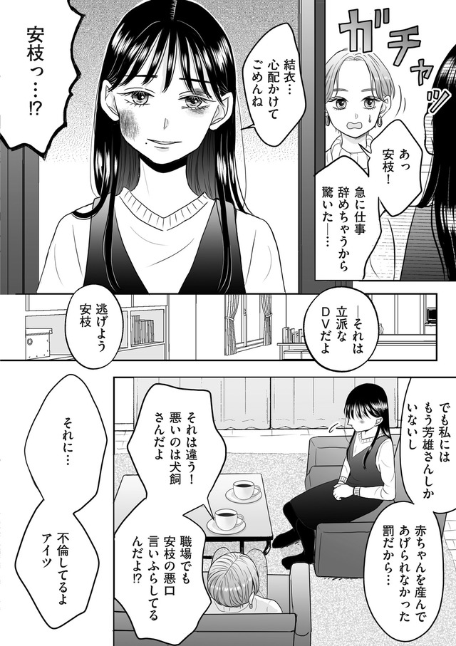 社内でも評判のエリート芳雄と結婚した安枝だが、夫からDVを受けたストレスで流産してしまう。