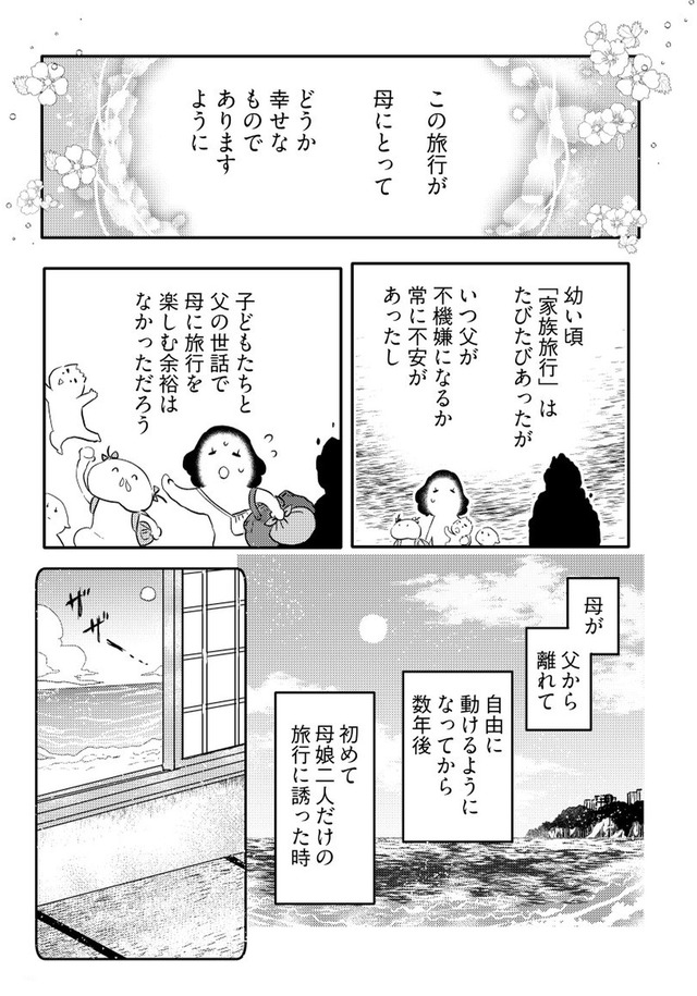 年間に何度も旅する漫画家の“私”が、旅慣れない母を連れて向かったのは関東への二人旅。壊れたサンダルで現れる母に始まり、行く先々でハプニング続出。