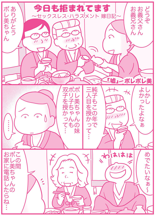 結婚後も続くセックスレスに苦しむポレ美。訪れたチャンスも逃し、実家では妹の妊娠で期待が高まる中、進まない妊活や子宮頸部の異常、義姉の妊娠が重なり追い詰められていく。ついに夫へ土下座で訴えるが、すれ違いは深まり心身はさらに闇の中へ――。レス問題の現実を赤裸々に描く第2弾。※本記事はポレポレ美著の書籍『今日も拒まれてます~セックスレス・ハラスメント嫁日記~ 心の異変編』から一部抜粋・編集しました。******▶▶関連記事を読む【次回】#16に続く何のために妊活をしているのかわからない…ずっと記録し続けてきた基礎体温表をゴミ箱へ【今日も拒まれてます2 #16】