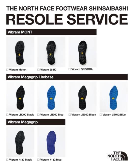 また、ヴィブラムジャパン株式会社が提供するアウトソールを使用した「Resole Service(リソールサービス)」では、すり減ったアウトソールを、優れたグリップ力と耐久性を誇る「Vibram Sole(ヴィブラムソール)」9種類(オープン時)から選んで交換することができる。好みのソールに交換できることで、オリジナルのフットウエアとして楽しみながら長く履き続けられる点も特徴。製品を長く使うという、サステナビリティの視点にも配慮したサービスとなっている。