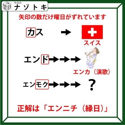 今度は真ん中をみてみましょう。「エンド」が「エンカ」に変わっています。つまり「ド」が「カ」に矢印3つで変わっているのですね。ここまでくればピンときた人もいるのではないでしょうか。そうです!曜日です。つまり、曜日になる部分が矢印の数だけずれているのですね。あとは答えを考えていきましょう。問題は「エンモク」でモクの部分が変化します。矢印は3つありますから3日分曜日がずれます。