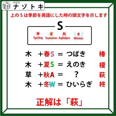 あとはそれぞれに該当する季節の漢字を当てはめ、答えを考えていきましょう。すると上図のようになりますので、正解は「萩」となります。