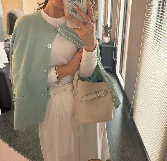 慌ただしい季節こそ、目から入る色彩で気分をリフレッシュしたいもの。midopeiさんは、ユニクロの「ソフトリブクルーネックT」1,990円(158cmでサイズS着用)をインナーに使い、春らしいミントグリーンのカーディガンをさらりと肩掛け。膨張しがちなホワイトのワントーンに、清潔感のある淡いカラーを重ねることで、全体の印象がぐっと引き締まります。