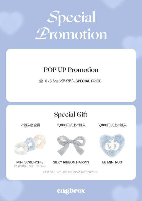 ・購入特典購入者全員:HAIR SCRUNCHIE プレゼント(先着100名)5,000円以上購入:SILKY RIBBON HAIRPIN7,000円以上購入:EB MINI RUG