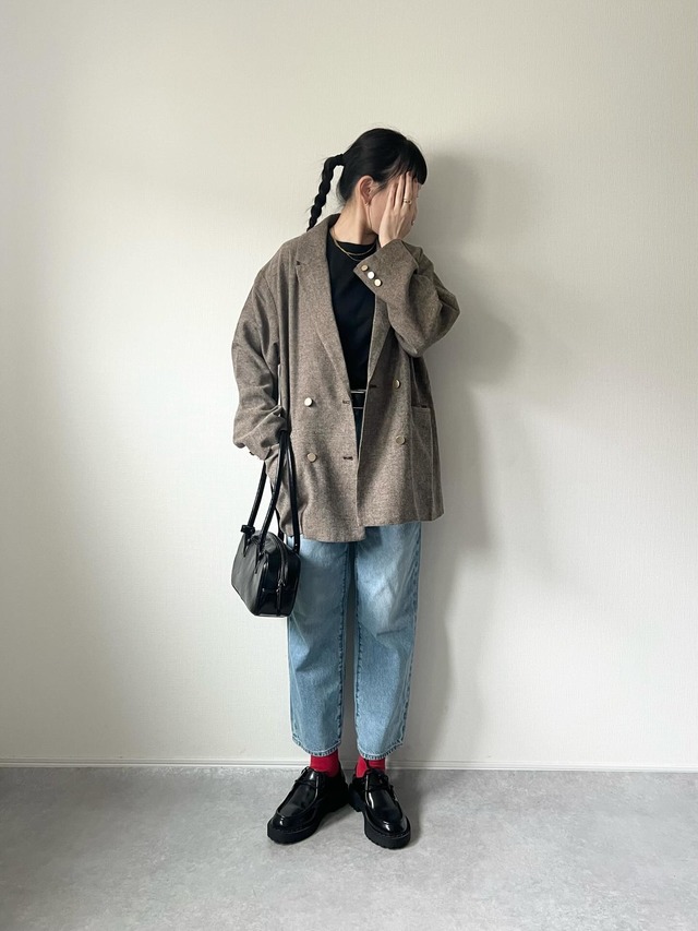 季節の変わり目に悩みがちなアウター選びですが、今季はオーバーサイズのジャケットが頼りになります。ko.wearさんは、ブラウンのダブルジャケットに、ユニクロの「クルーネックTシャツ」1,500円(160cmでサイズS着用)とGUの「ストレートアンクルジーンズ」2,990円(160cmでサイズ不明)をコーディネート。一見ベーシックなトラッドスタイルですが、足元からGUの「リブパイルアンクルソックス」値下げで190円の赤をチラリとのぞかせているのがおしゃれ。
