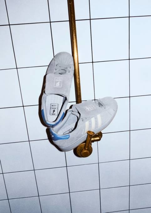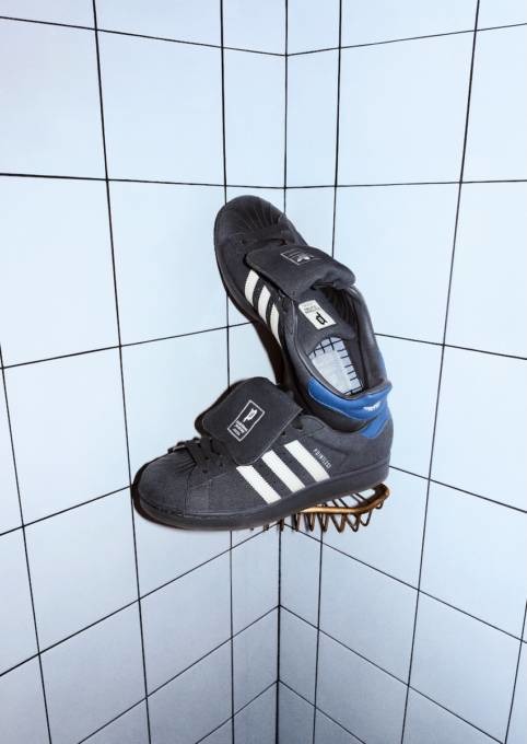 ディテールにも、常田の美意識が随所に反映されている。シュータン裏には本人のサイン刺繍を施し、取り外し可能な2種類のロングシュータンを付属。さらに、サイドには通常の「SUPERSTAR」ロゴに代えて、「POINTLESS JOURNEY」の刻印を採用。付属品として、2組のシューレースとカスタマイズ用のメタル製シュータン グラフィックピン(2種)を同梱。細部に至るまで、着用者自身が完成させることを前提に設計された一足となっている。
