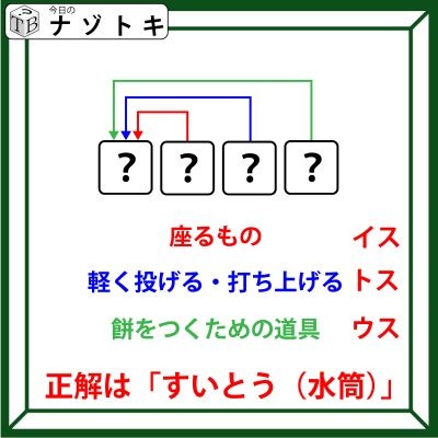 「座るもの」は「イス」、「軽く投げる・打ち上げる」は「トス」、「餅をつくための道具」というのは「ウス」を表します。あとはそれぞれの文字を配置していきましょう。正解は「すいとう(水筒)」でした。