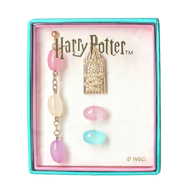 バーティー・ボッツの百味ビーンズのパッケージデザインを落とし込んだプレートピアスや色とりどりのビーンズを再現したゆらゆら揺れる三連ピアス、つるっとした質感がかわいらしいグリーンとピンクの一粒ピアスとのセットアイテム。ゴールドのモチーフが印象的な百味ビーンズプレートピアスを使用したり、ポップな印象のビーンズを組み合わせたりと、気分やシーンに合わせて多様な楽しみ方ができる。【ハリー・ポッター ハニーデュークス ブレスレット】