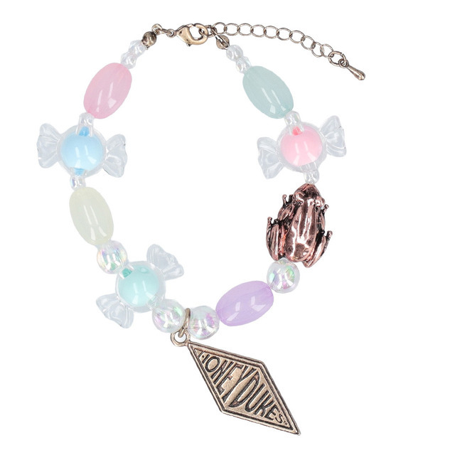 百味ビーンズやキャンディの形のビーズの、ハニーデュークスデザインのブレスレット。パステルカラーのビーズにプラスして、アクセントになる蛙チョコレートやハニーデュークスのメタルパーツをあしらった。同日発売のネックレスセットやピアスセットと合わせて着用するのもおすすめだ。また、店舗にて3,300円(税込)以上の買い物をすると「ステッカー(全8種・非売品)」が一つプレゼントされる(配布中~なくなり次第終了)。