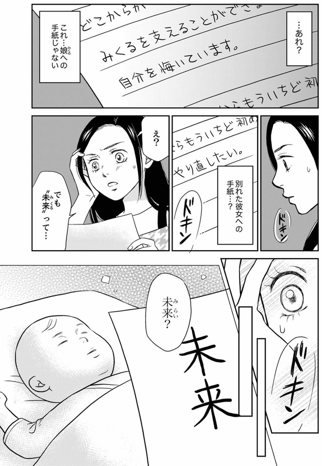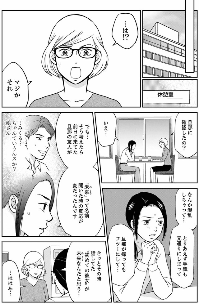 優しい夫と3歳の娘を持つ爽子は、慌ただしくも幸せな毎日を送っていた。そんなある日、夫が元カノの未来(みるく)に書いたラブレターを見つけてしまう。「娘に元カノの名前を付けたの…!?」夫の秘密の秘密を知ってしまい、夫の背後に見え隠れする女性の影を感じる爽子。娘と夫に近づく女の正体は身近にいた意外な人物だった…!?※本記事は、樹ユウマ 著の電子書籍『右手に指輪をする夫』から一部抜粋・編集しました。******