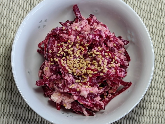 作り方は、ビーツ(1/2個:約250g)の皮をむいて細切りにした後、塩をまぶしてしんなりさせて、軽く水分をふき取ります。山芋(30g)はピーラーで皮をむいた後、ビーツの2倍程度の太さに切ります。豆腐(木綿1/2丁:約150g)は重しをのせて水切りをします。