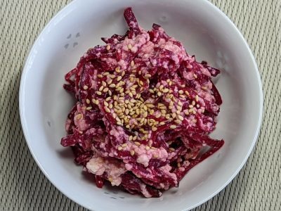 これらの“肝・脾の機能にうれしい食材”を使ったおススメレシピの1つ目は「ビーツと山芋の白和え」です。これから初夏を迎えると、スーパー・道の駅などの野菜コーナーに並んでいる“ビーツ”を目にする機会があるかもしれません。ビーツはボルシチ料理で有名ですが、それ以外の食べ方をレシピにしてみました。