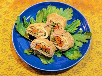最後に“信田巻き”にします。開いた油揚げの巻き終わりを1cmほど残して、アボカドみそ・豚ひき肉の順に塗り広げます。巻き始めに春菊の茎・にんじんを置いてくるくると巻き、巻き終わりに小麦粉をつけて楊枝で留めます。水(1リットル)を沸かした鍋にティーバッグに入れたプーアル茶葉(小さじ2)を入れて強火で5分煮だします。ティーバッグを取り去った後、鶏ガラ粉末(大さじ1)・しょうゆ(大さじ2)・酒(大さじ2)・みりん(大さじ2)を入れて加熱し、厚手のキッチンペーパーで落し蓋をした状態で“信田巻き”を15分ほど中火で煮込みます。楊枝を抜いて食べやすい大きさに切り、春菊の葉をひいた器に盛りつけたら出来上がりです。