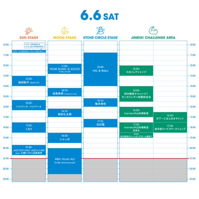 会場:富士山こどもの国(静岡県富士市桑崎1015)出演:6月6日(土)くるり/ハンバート ハンバート/田島貴男 (Original Love)/YOUR SONG IS GOOD (CHILL & DUB)/ JAZZ NOT ONLY JAZZ in FJSN(石若駿 × 渡辺翔太 × マーティ・ホロベック) feat. 大橋トリオ & 田島貴男/奇妙礼太郎/柴田聡子(BAND SET)/シャッポ/北村蕗/梅井美咲/HAL & Baku 6月7日(日)never young beach/ハナレグミ/KIRINJI (弾き語り) /cero/藤原さくら/君島大空/寺尾紗穂/優河/鎮座DOPENESS/CHO CO PA CO CHO CO QUIN QUIN/眞名子 新