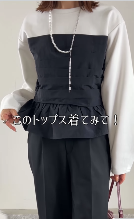 白と黒のバイカラーが目を引くビスチェレイヤード風トップスに、黒のタックワイドパンツを合わせたシックな着こなしを披露しています。ドッキングデザインのトップスは、計算されたウエストギャザーが腰位置を高く見せ、自然に脚長効果を発揮。異素材を組み合わせたコントラストが、コーディネートに奥行きを与えています。
