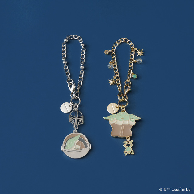 マンダロリアンとポッドでぐっすり寝ているグローグー、喜んでいるグローグーとソーガン・フロッグを合わせた2種類のバッグチャームは、チェーンの色やデザイン異なる仕様がポイントだ。