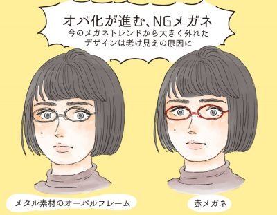 その名の通り、楕円型のフレームなので顔が間延びして見えやすいというデメリットがあります。かつスタイリッシュに見えるメタルフレームは10年以上前の定番メガネの象徴。40代という年齢も相まってどうしてもオバ見えが加速しやすいです。このほか、要注意は赤フレームのメガネ。赤メガネは筆者の記憶が正しければ、10年以上前に一度こうした派手なカラーメガネが流行していました。その頃に買ったメガネをそのまま活用している、当時と同じデザインのものばかり選んで買い替えているといった方は要注意。一昔前の流行デザインのメガネをしているとそれだけ老け見え感が出てしまうので3~5年単位でメガネのデザインはアップデートしていくと良さそうです。
