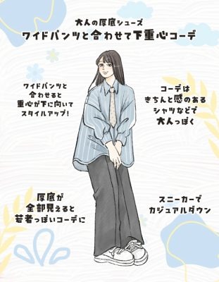 厚底スニーカーを、ワイドパンツと組み合わせ