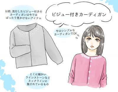 カーディガンのネックラインにキラキラと光るラインストーンやビジューが散りばめられているビジュー付きカーディガン。これは10年以上前に流行していたコンサバスタイル時代に生まれた上品なアイテム。首元がキラキラしていると見た目も華やかで品良くまとまるため、とても人気が高かったです。