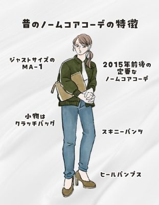 デニムにMA-1を合わせる着こなし自体は、令和の今でもよく取り入れられるコーデですが、10年前と大きく違うのはシルエットです。2015年頃はアウターもボトムスも今ほどはゆったりしておらず、現在のスタイルで考えると、やや細身のシルエットで構成されています。デニムもワイドではなくスキニーよりのストレートタイプが主軸でした。とくに女性は、アウターがメンズっぽいのでデニムは細身でパンプスを合わせてキレイめにコーディネートするというのが鉄則でしたね。残念なことに、この当時そのままのコーデをしてしまうとちょっと古臭く見えてしまうので、気をつけたいところです。