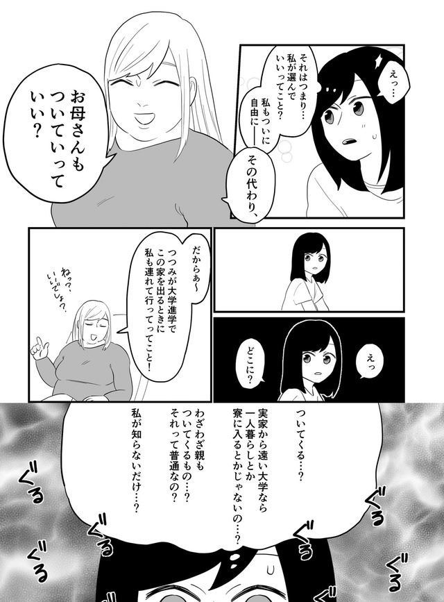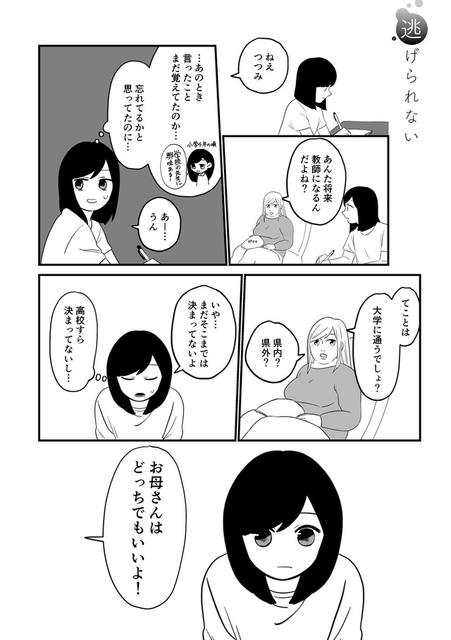 地獄のような生活の中で、つつみは自分を守るために必死にもがき、母親からの支配から抜け出そうと決意する。
